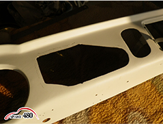部品取りより切り出し、仮サフェ状態のダッシュパネルの左サイドと中央の穴埋め作業から始めます。