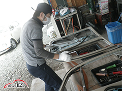 634.~636. 鈑金屋が室内に入り、オーナー様にサポートをお願してガラスをはめ込んだ後は、