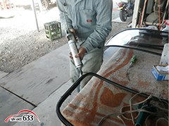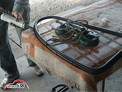 Rrガラスからはめ込み準備をし、シールの溝に綿紐を入れウレタンシールを注入します。