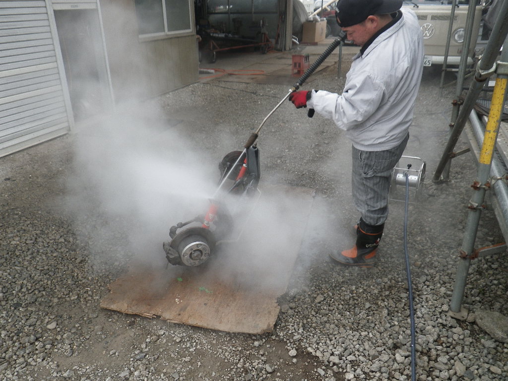 先ずは、昨日バラしたFr足回りのスチーム洗浄から!