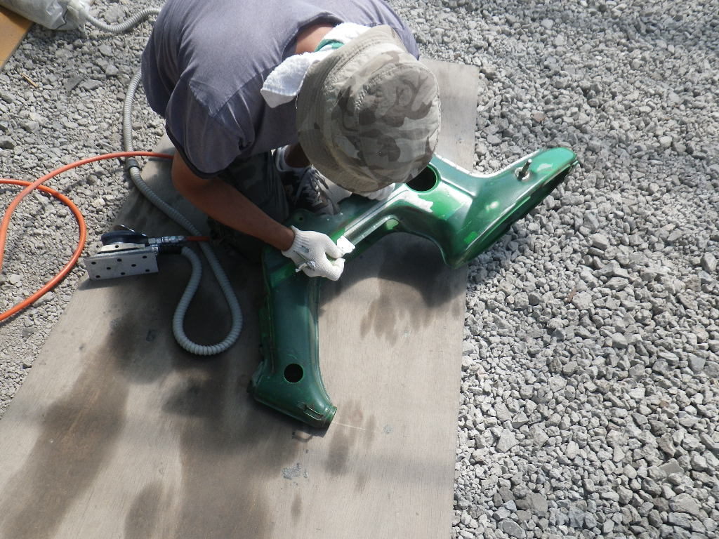 前回までにメカニック育成ヒロシがフレームの削り加工を済ませてくれているので、ペイントの下準備をしてもらいました。