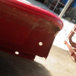 そして作業開始!先ずは、Rrエプロンの右Rrフェンダー側の縁にもダメージが有り、あちこちにクラックが入っていたので剥離をして鈑金補修をしました。